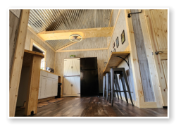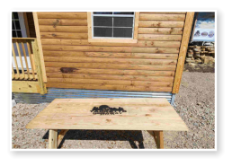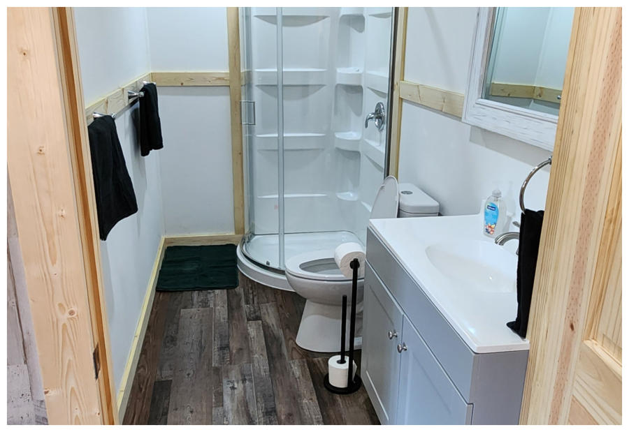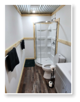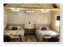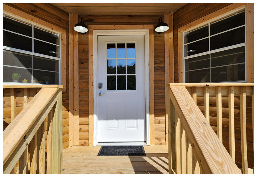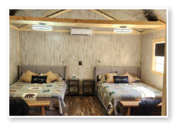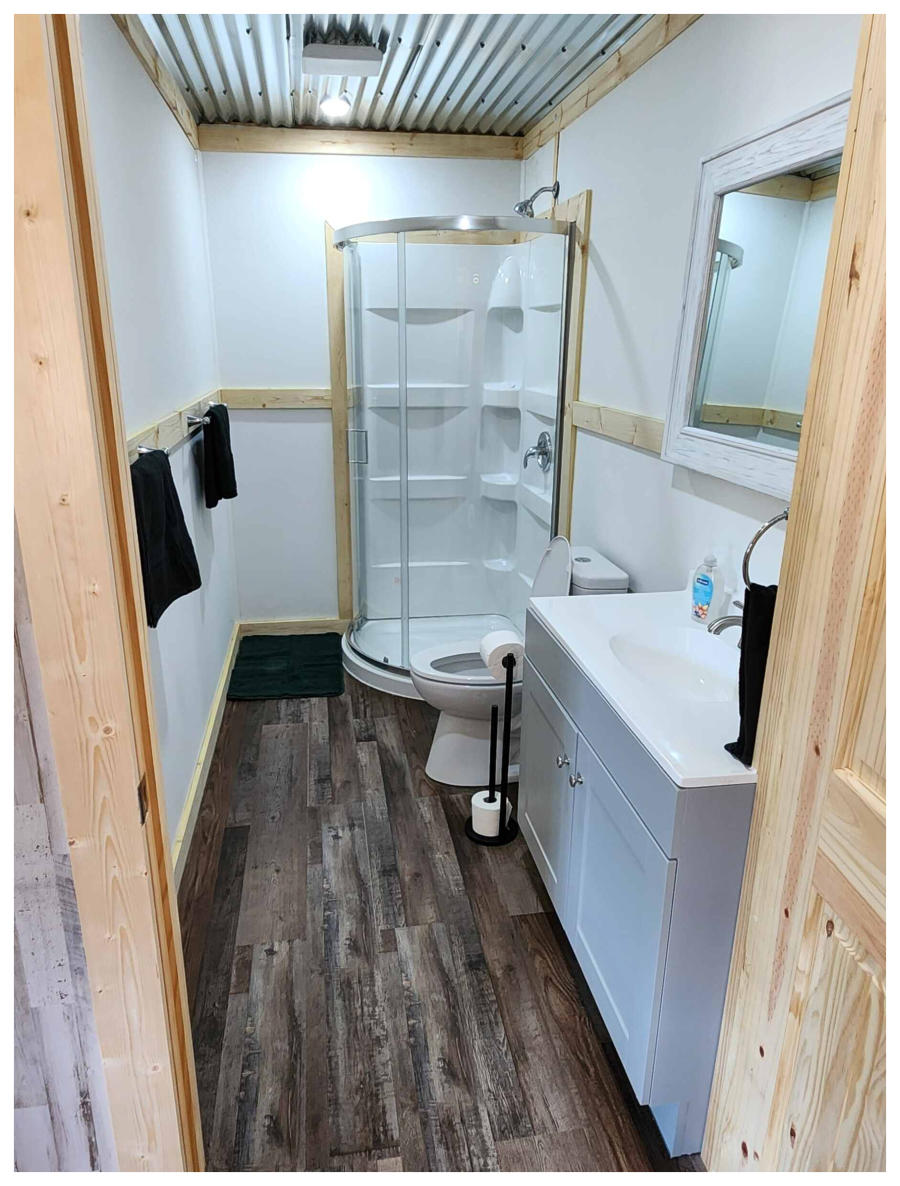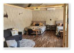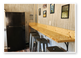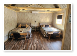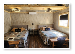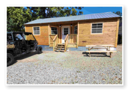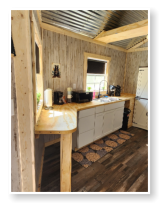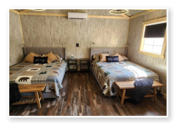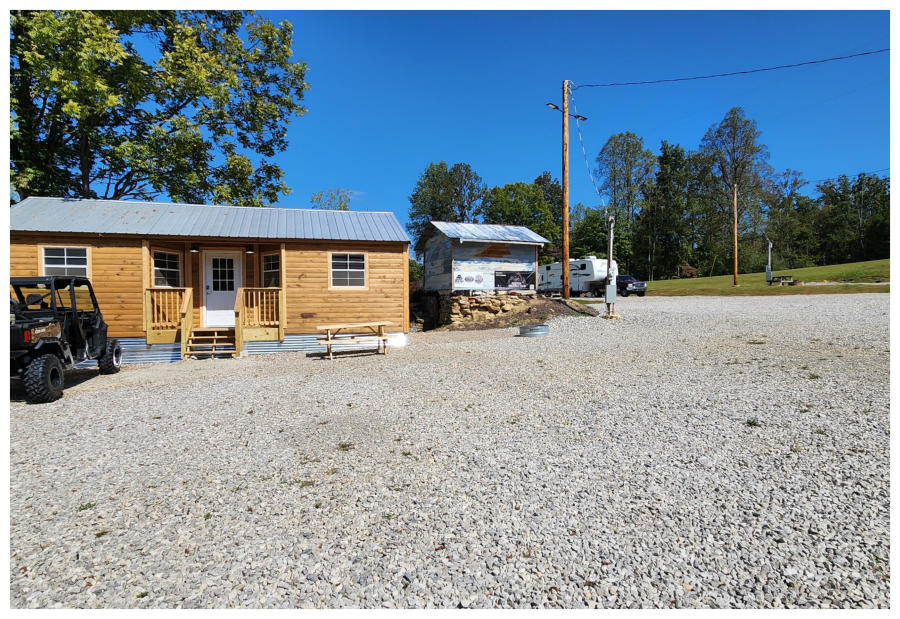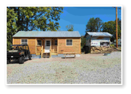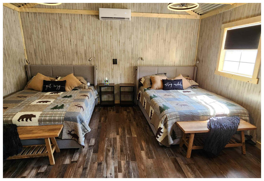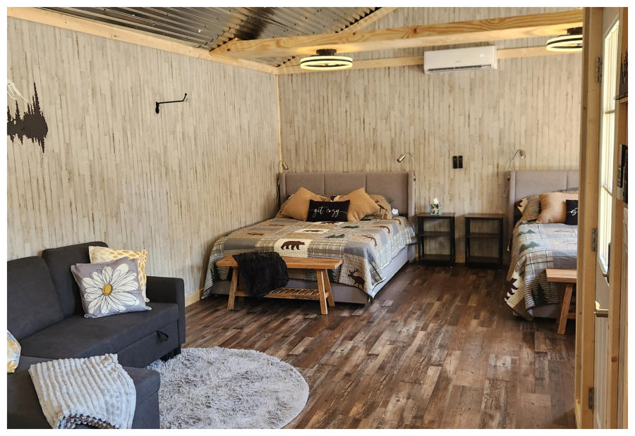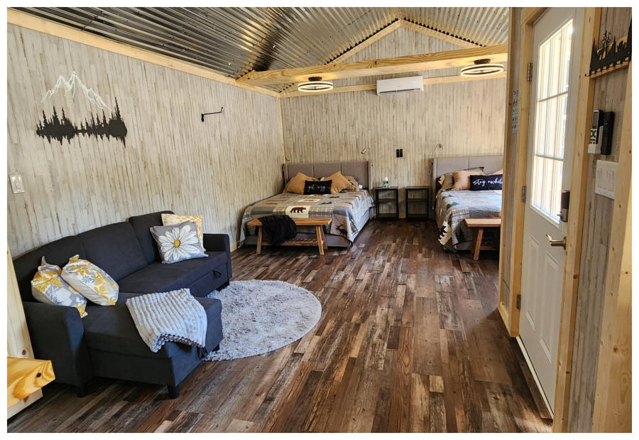 LiL Tackett Cabin (Sleeps 2-4)  •	Queen Bed & Queen Pull Out Couch  •	Bathroom With Full Shower and Linens •	TV •	Kitchen  •	Air Fryer •	Griddle •	Toaster •	Coffee Maker •	Microwave •	Refrigerator •	All Utensils