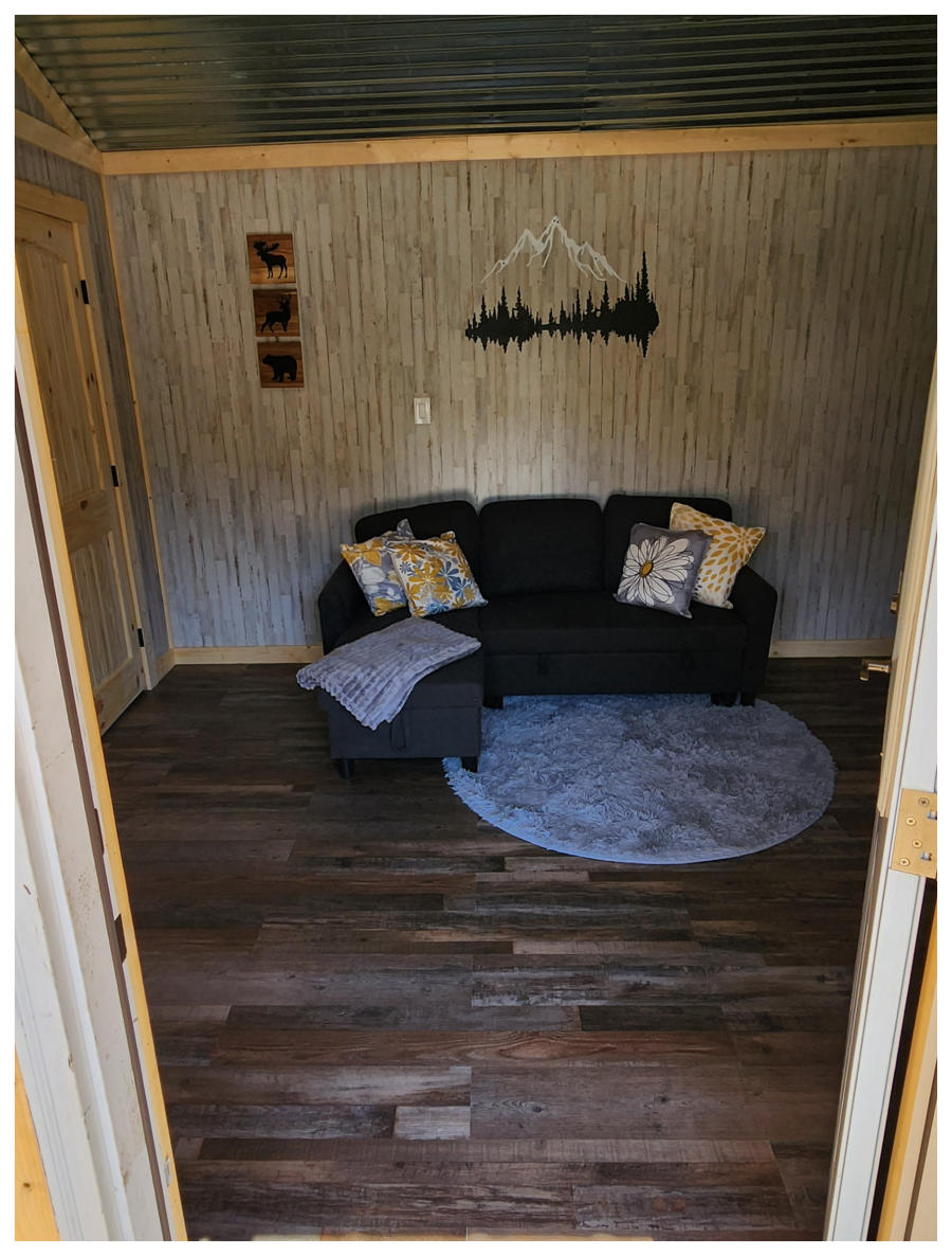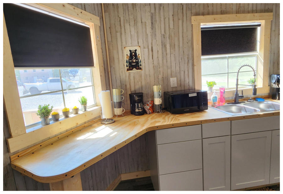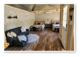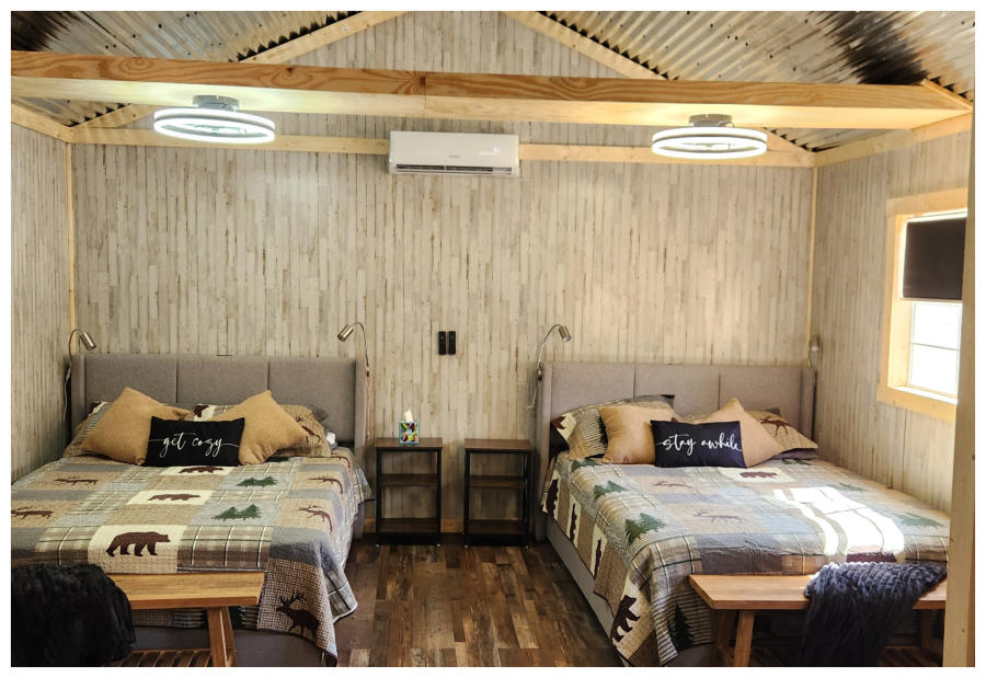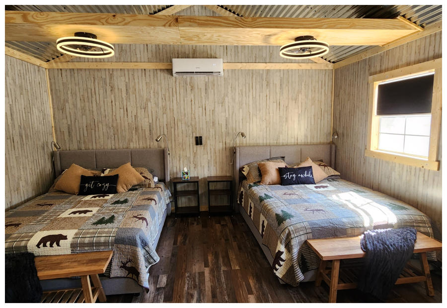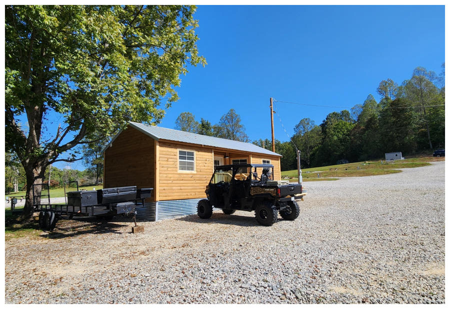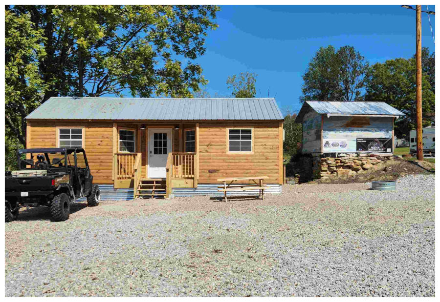 LiL Tackett Cabin (Sleeps 2-4)  •	Queen Bed & Queen Pull Out Couch  •	Bathroom With Full Shower and Linens •	TV •	Kitchen  •	Air Fryer •	Griddle •	Toaster •	Coffee Maker •	Microwave •	Refrigerator •	All Utensils