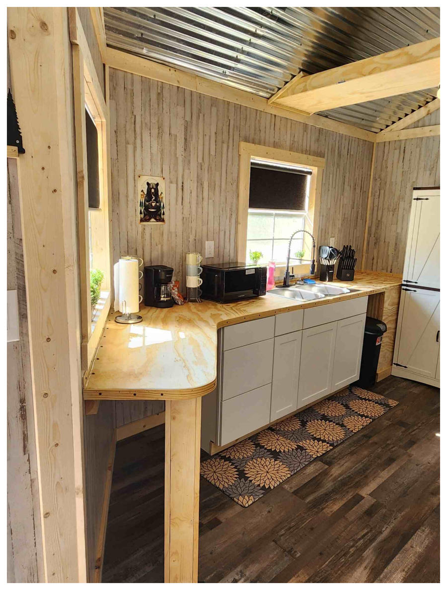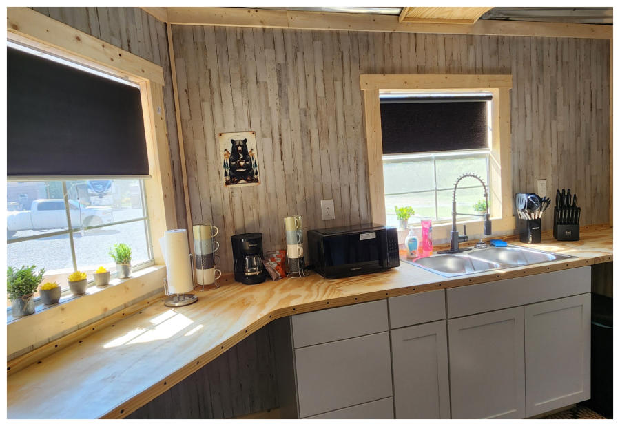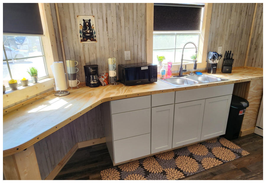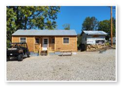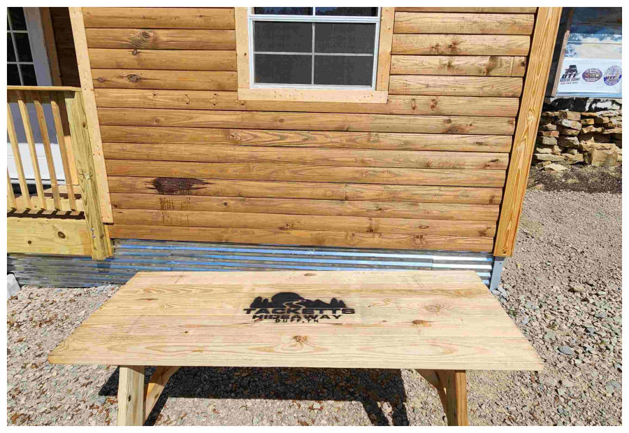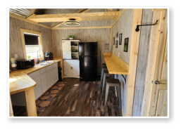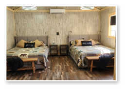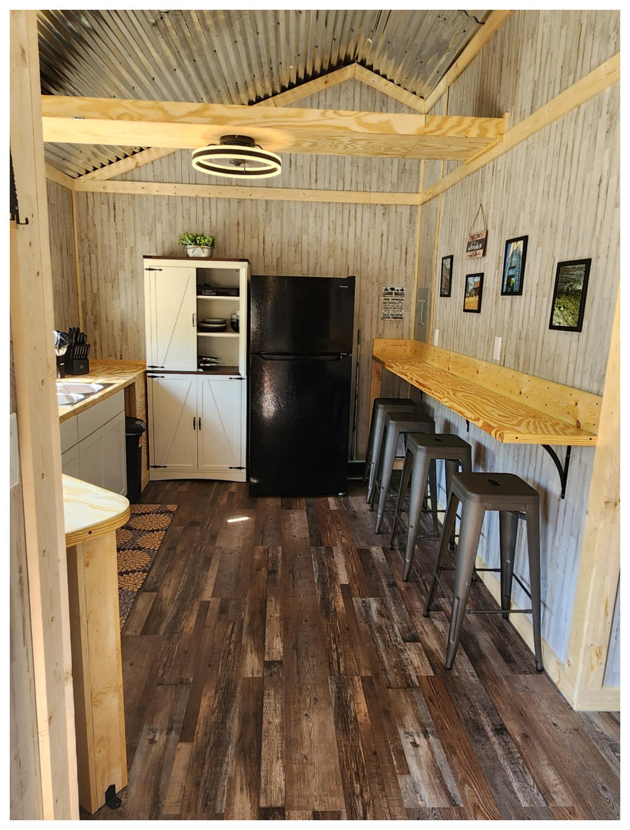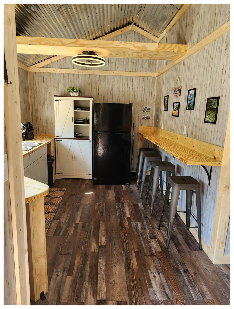 LiL Tackett Cabin (Sleeps 2-4)  •	Queen Bed & Queen Pull Out Couch  •	Bathroom With Full Shower and Linens •	TV •	Kitchen  •	Air Fryer •	Griddle •	Toaster •	Coffee Maker •	Microwave •	Refrigerator •	All Utensils